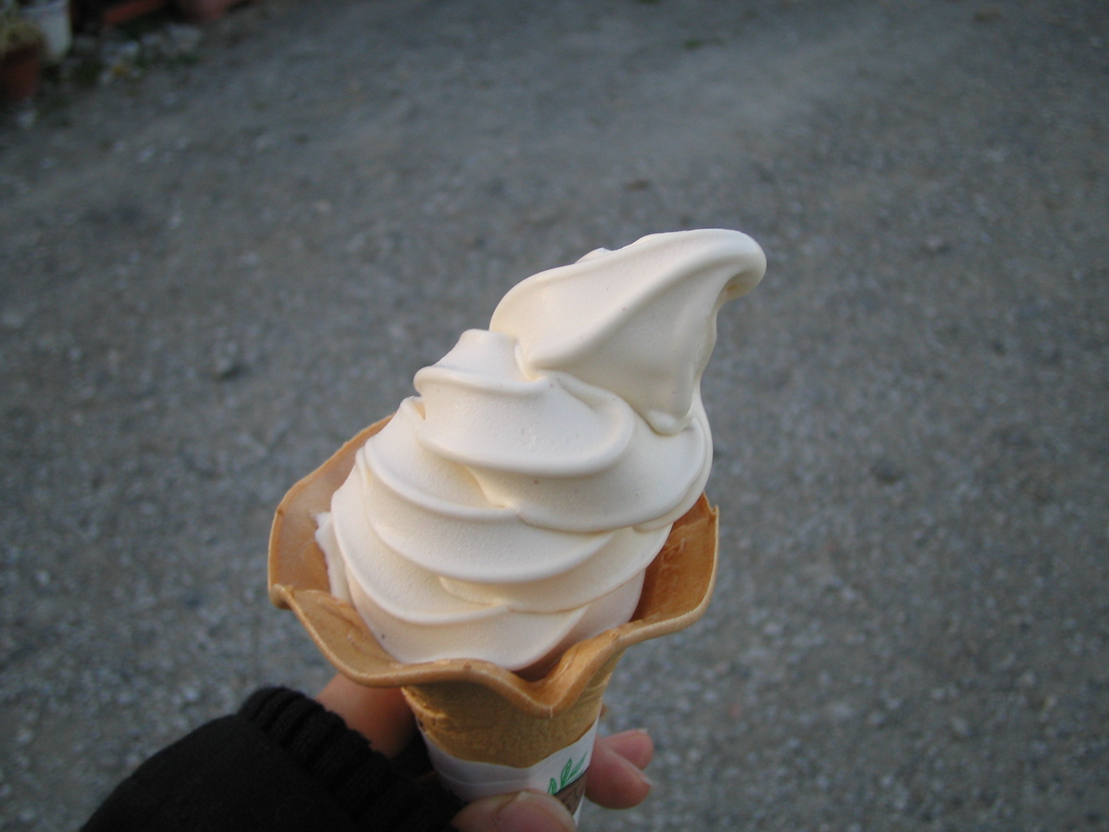 帰り、いいもの見つけちゃった~ピーナッツソフトクリーム~味は・・・ピーナッツバターをアイスにしちゃったよって感じ(笑。美味しかった♪これじゃ分かりにくいかもしれんけど、うっすら茶色なんだよね、このアイス。